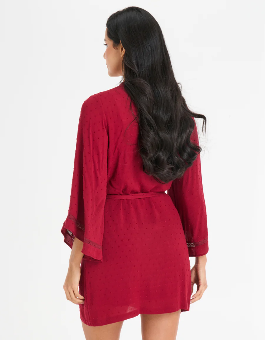 طقم قميص نوم قصير وروب بحواف كروشيه باللون الخمري، مصنوع من قماش ناعم وخفيف. يبرز القميص القصير قوامك الأنثوي بأناقة، بينما يضيف الروب المتناسق لمسة عملية وعصرية. تضيف حواف الكروشيه المميزة لمسة من الرقي والأناقة على إطلالتك في الأمسيات المنزلية.