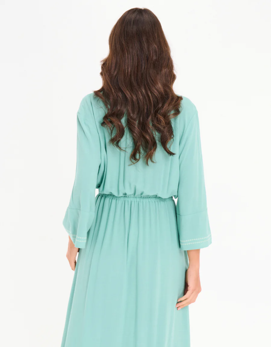 فستان منزلي أنيق بلون أخضر فاتح مصمم من خامة خفيفة بقصة واسعة، لإطلالة نهارية بسيطة.