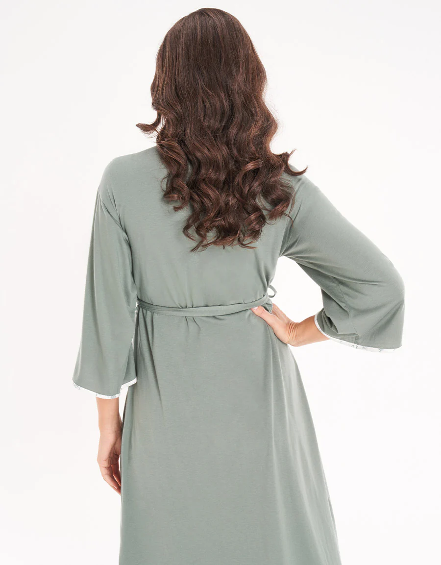 يتميز هذا الطقم بفستان جيرسي ناعم مزين بطبعات ودانتيل كروشيه، مع حمالات عريضة من نفس القماش وأزرار مغطاة. يشمل الطقم روب متناسق من الجيرسي مزينًا بتفاصيل جميلة.