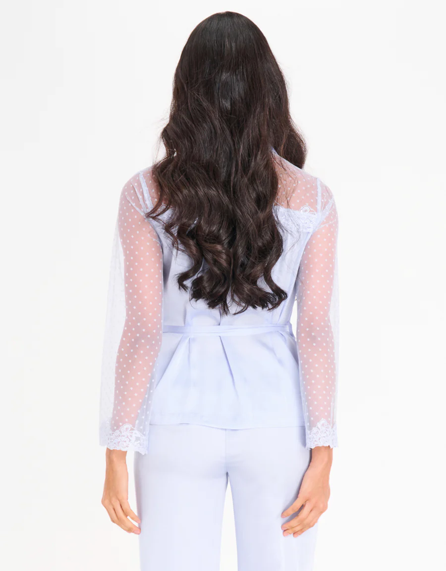 طقم بيجاما من الساتان بلون أزرق فاتح، بملمس حريري وتصميم هادئ يعكس أناقة بسيطة.