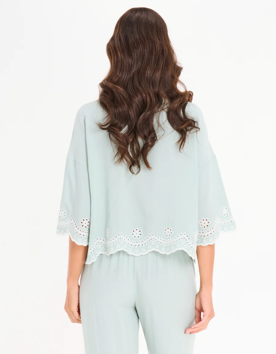 طقم بيجاما أخضر فاتح بلمسة كلاسيكية، مثالي للاسترخاء بهدوء أو نوم مريح بإطلالة ناعمة.