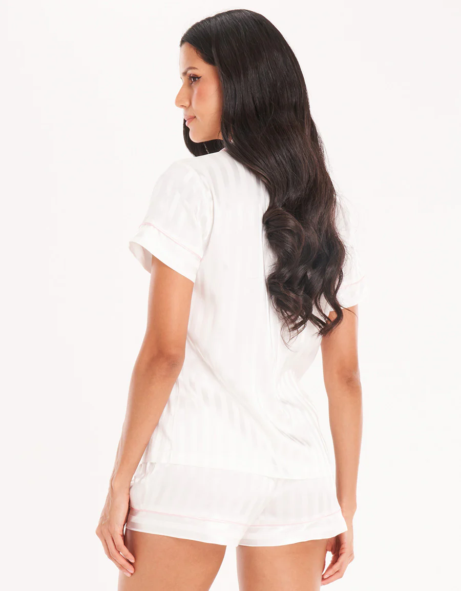 استمتعي بملابسك الرياضية مع هذا الطقم من الشورت الساتان المخطط باللون الأبيض والجاكار. القماش الساتان الناعم والنمط المخطط الأنيق يجعله الخيار المثالي للاسترخاء الأنيق والليالي الهادئة.