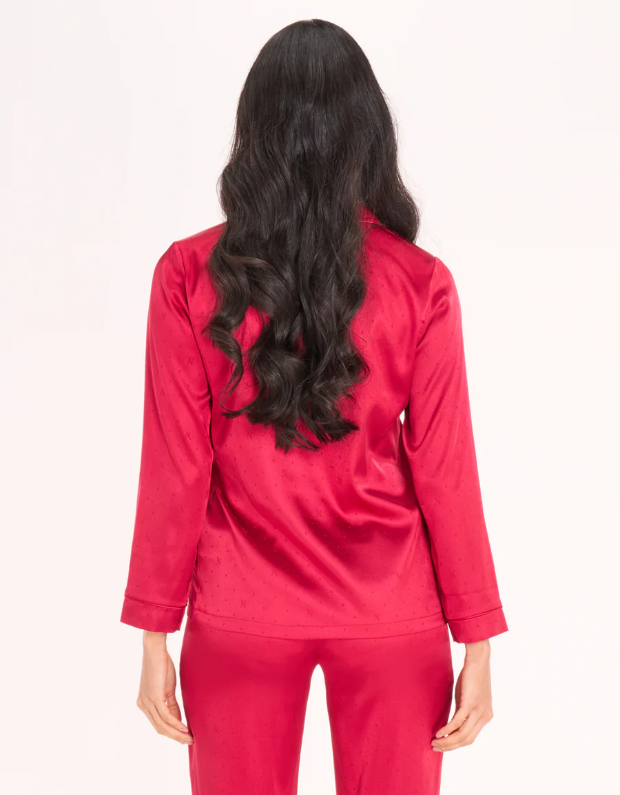Celebrate Winter Nights In This Red Satin Jacquard Satin Pajama Set. Smooth And Silky, It Offers A Refined Silhouette Ideal For Festive Nights. A Must-have For Cozy Nights And Chic Winter Style.