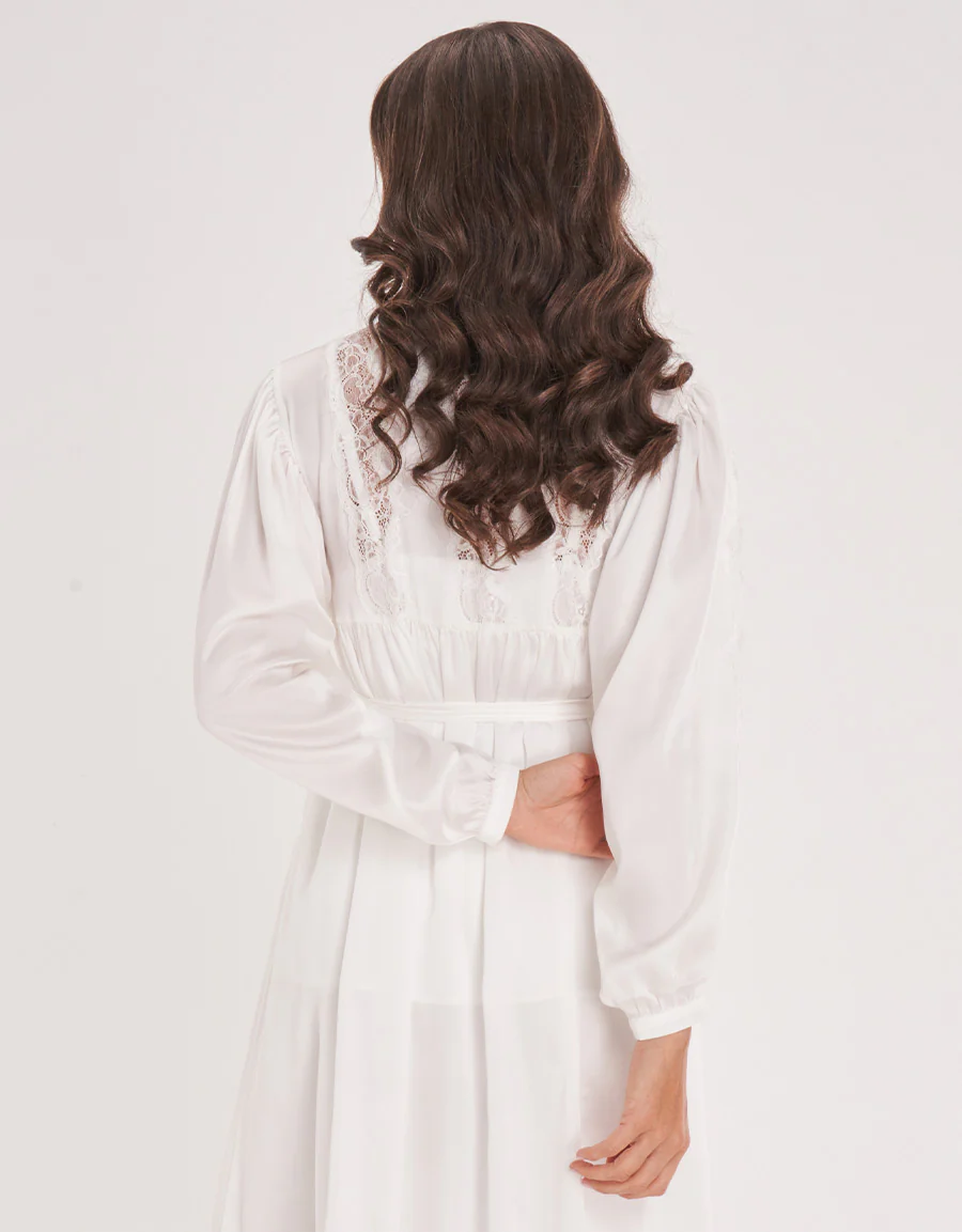 يتميز هذا الطقم الساتاني بمزيج من الأناقة والراحة، حيث يشمل بيجاما ساتان وروب طويل. مزين بتطريزات من الدانتيل، وأزرار مغطاة بالقماش، وأحزمة عريضة، وتصميم انسيابي، مما يجعله قمة الفخامة.