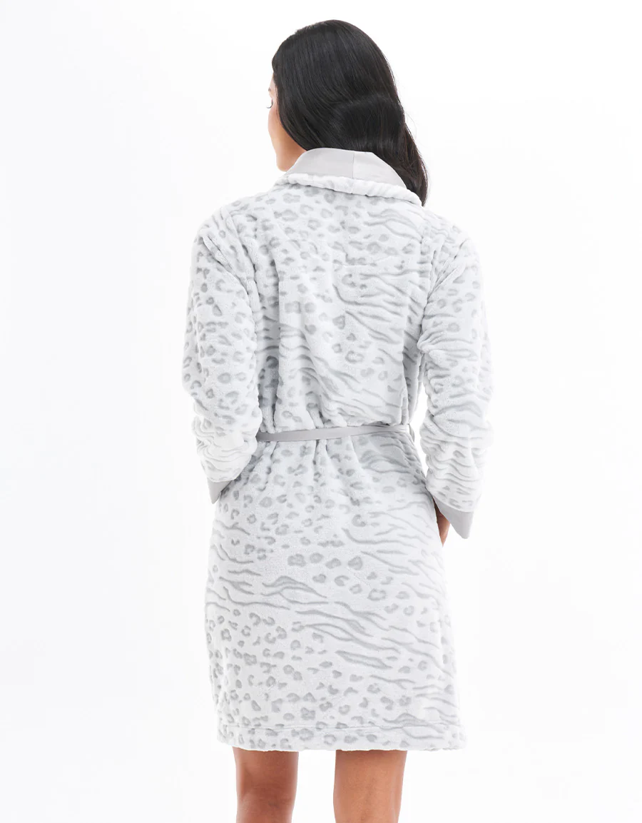 ارتقي بملابس الاسترخاء الخاصة بكِ مع هذا الروب القصير المصمم من الصوف الجاكار الناعم. يتميز الروب الرمادي بياقة وأساور من الساتان، مما يوفر لكِ الأناقة والراحة. يعزز الطباعة الفريدة من الجاكار جاذبيته الأنيقة، مما يجعله إضافة مثالية لمجموعة ملابس المنزل الخاصة بكِ.